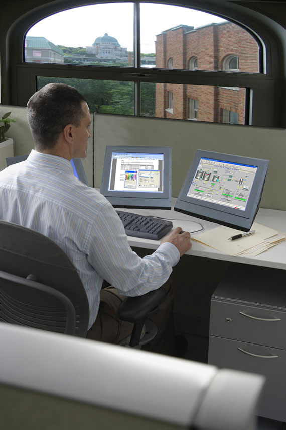 The TR-MS is an angled desktop monitor stand. Transduction 15" and 19" industrial panel mount monitors and computers are compatible with this stand. Also panel mount monitors and computers from Allen-Bradley and Xycom are compatible with these stands. TR-MS is a versatile stand that can be used in different environments, from the office to industrial and laboratory.